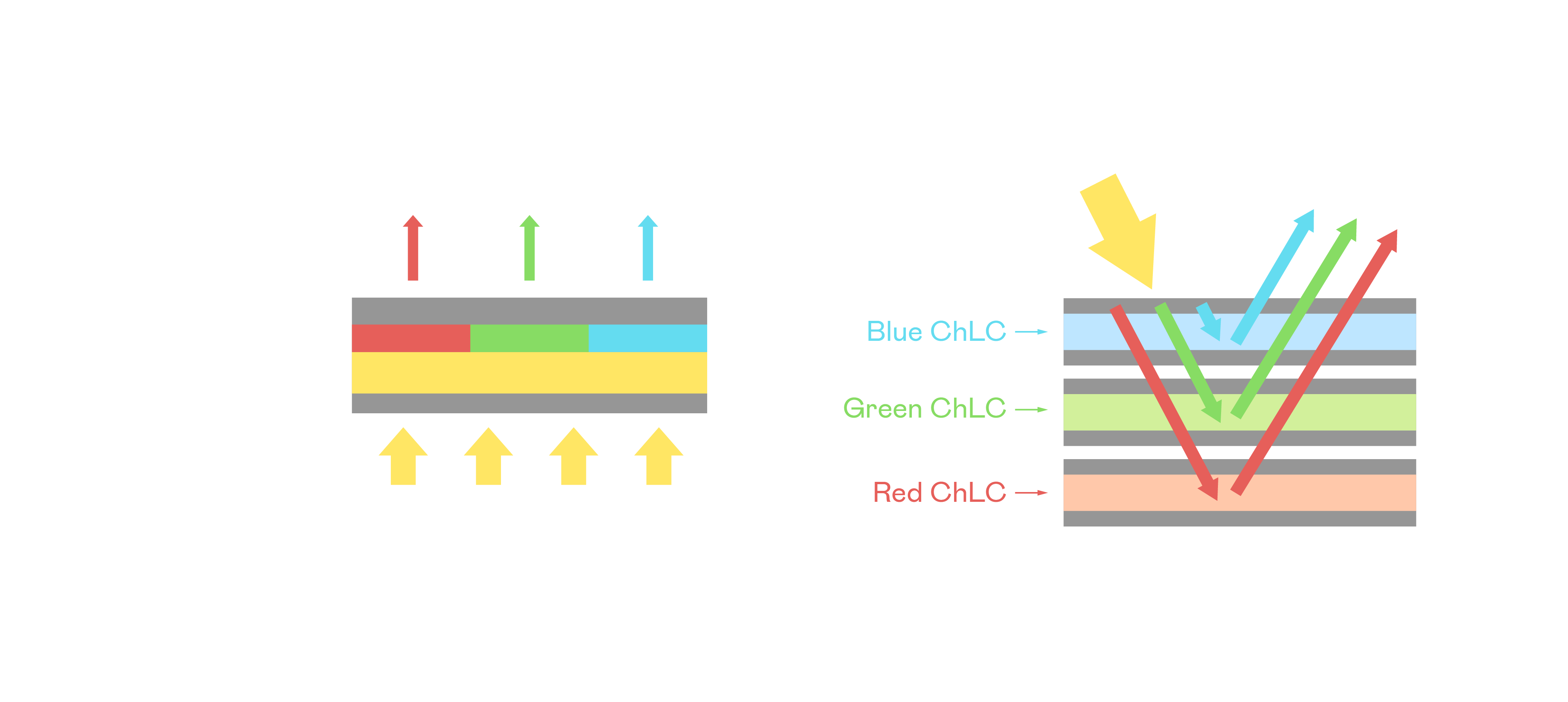 EZPay胆固醇液晶显示器是由红、绿、蓝三层胆固醇液晶面板堆叠而成,并采用无彩色滤光片设计,减少环境光在反射过程中的损耗。